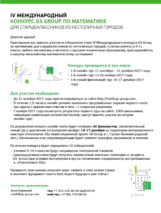 Конкурс по математике для старшеклассников из нестоличных городов «Я решаю!» является одной из ключевых инициатив образовательной программы инвестиционного холдинга GS Group и проводится на протяжении шести лет. Инициатива холдинга направлена на популяризацию технического образования в молодежной среде и формирование у старших школьников компетенций, востребованных в высокотехнологичной сфере.